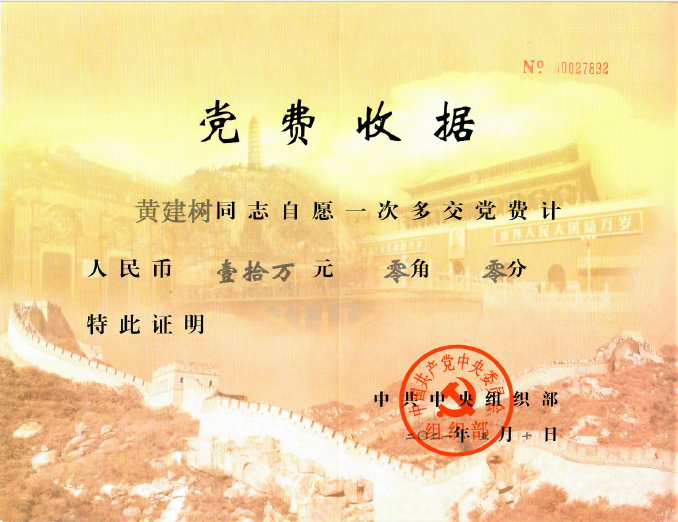 9月18日,广州电子党委办公室主任郑汉书上门将中共中央组织部开出的十万元党费收据送到黄建树同志手中。郑汉书向黄建树致以崇高的敬意,感谢他为党的事业和广州电子发展做出的贡献。同时,在中秋佳节来临之际,向黄建树致以了节日的问候。