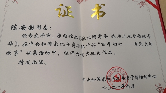近日,由中央和国家机关工委老干部活动中心举办的“百年初心一老党员的故事”作品征集活动公布了获奖名单,中国科学院亚热带农业生态研究所选送的退休研究员陈安国的作品《 依祖国需要 我为三农护航献年华》获得“优秀奖”。