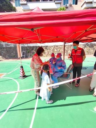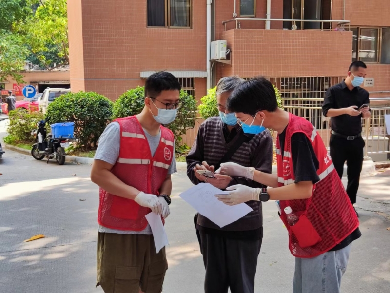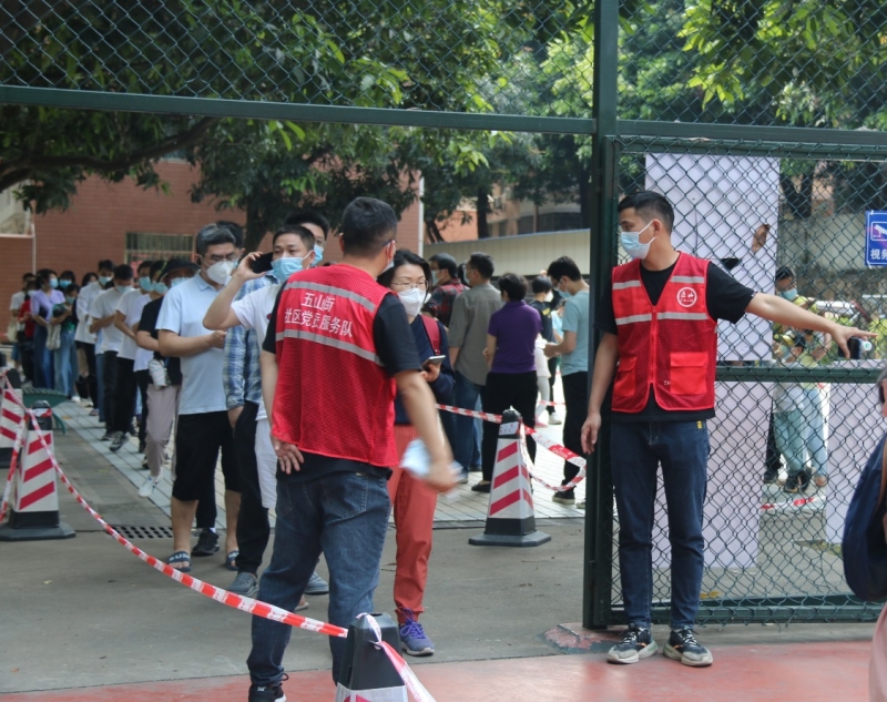 两次核酸检测,40余名党员志愿者自觉冲在疫情防控最前沿,积极组织群众、帮助群众。他们当中有科研骨干、有管理人员、也有研究生。身穿红色马甲的志愿者负责维护现场秩序,帮助不会使用手机的老年人录入信息;身穿蓝色隔离衣的志愿者顶着烈日连续五个多小时负责信息的扫码登记工作。志愿者们两天合计服务社区居民近6000人次,为核酸检测工作的顺利开展提供了有力保障。相关工作得到了五山街道党工委和五山街道办事处的肯定和称赞。