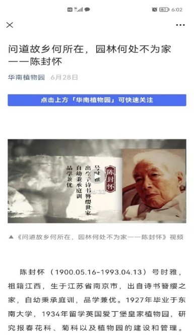 陈封怀(1900-1993)为我国植物园科学事业倾注一生心血,他执掌建设庐山植物园、南京中山植物园、武汉植物园、华南植物园;指导杭州植物园、广西植物园的规划与建设,是中国现代植物园主要创始人之一,被誉为“中国植物园之父”。