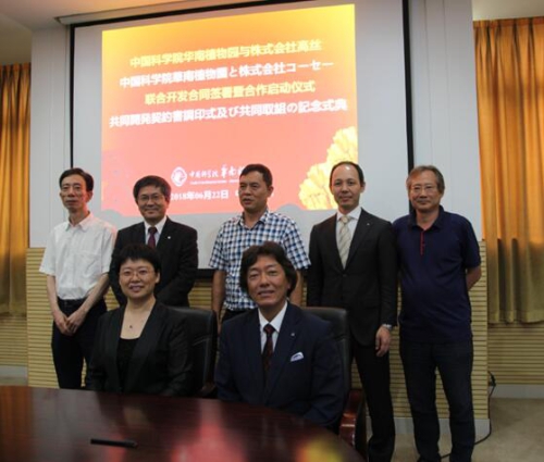 华南植物园农业与资源植物研究中心主任王瑛研究员与株式会社高丝研究所林昭伸(Hayashi Akinobu)所长签署了共同开发合同。华南植物园魏孝义、吴国江、夏念和研究员等共同见证了签约仪式。