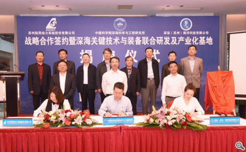 4月23日,苏州船用动力系统股份有限公司、中国科学院深海科学与工程研究所、深远(苏州)海洋科技有限公司合作签约仪式在苏州工业园区举行。深海所所长丁抗,苏州工业园区党工委委员、管委会副主任黄海涛,江苏省工业和信息化厅巡视员秦雁等参加活动。深海所副所长阳宁代表研究所在合作协议上签字。