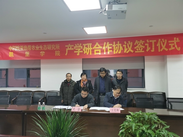1月15日,中国科学院亚热带农业生态研究所与凯里学院签署产学研合作协议仪式暨座谈交流会在亚热带生态所举行。所党委书记王克林与凯里学院副院长龙健进行了现场签约并就学科建设、科学研究、人才培养和产品研发进行了深入洽谈。