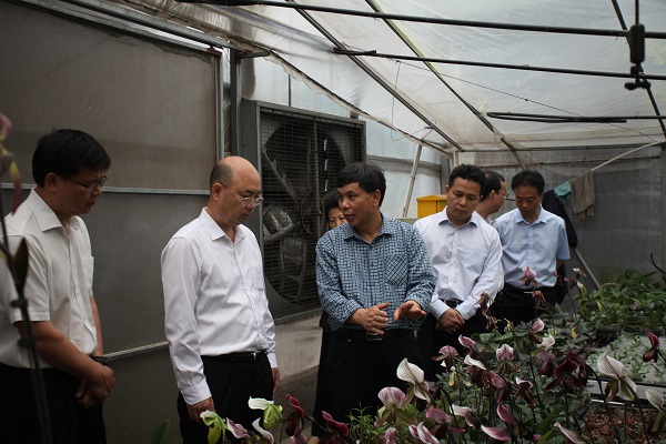 王瑞军一行首先调研了正在华南植物园展览温室展览的韶关兰花以及兰园。参观途中,园主任任海重点介绍了华南植物园近年来在迁地保育国家重点保护植物、经济植物利用、科研成果产业化以及为地方生态建设提供科技支撑等进展情况。随后考察了珍稀植物繁育实验基地,听取曾宋君研究员介绍了兜兰的种质资源开发利用、新品种培育及产业化情况。