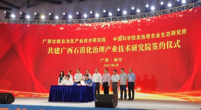 5月22日,2021年度全国科技活动周广西活动暨第三十届广西科技活动周广西创新驱动发展成果展开展期间,为进一步落实广西自治区人民政府与中国科学院2020年合作会商会议议定事项,科技助力脱贫攻坚与乡村振兴的有效衔接,中国科学院亚热带农业生态研究所与广西壮族自治区产业技术研究院共建的广西石漠化治理产业技术研究院签约仪式在南宁国际会展中心举办。