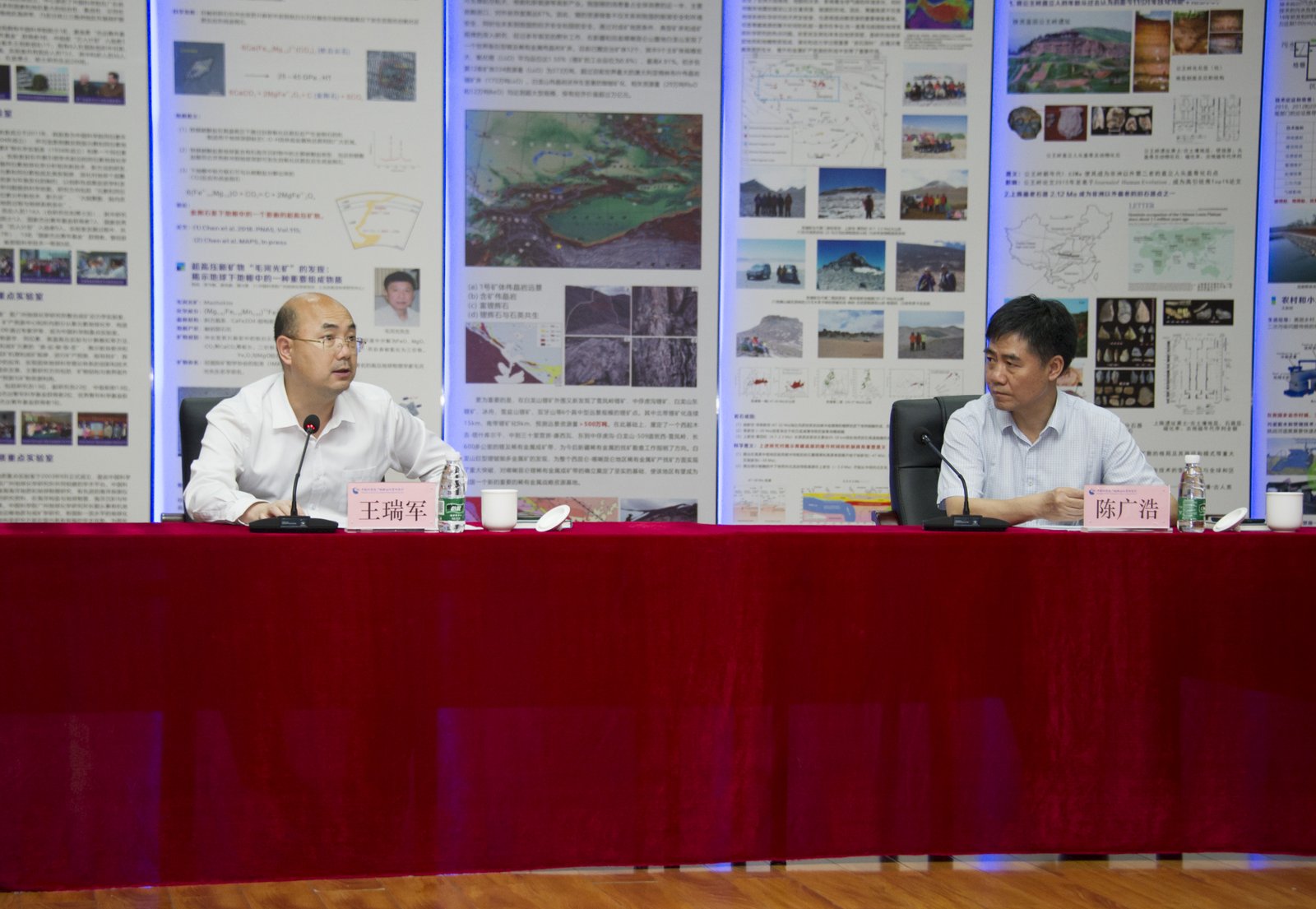 调研过程中,王瑞军首先实地考察了高温高压实验平台、二次离子探针实验室和14C专用加速器质谱实验室等大型科研仪器平台,详细询问了平台建设、运行和管理机制情况。座谈会上,张海祥从历史沿革、人员经费、研究领域、研究方向、组织架构、承接的重大任务和近年来取得的重大科技成果等方面介绍了研究所的整体情况。王瑞军充分肯定了广州地化所取得的科研成果,他结合2021年广东省科技创新大会部署新发展阶段科技创新重点任务、推动建设更高水平的科技创新强省的目标、推进战略科技力量建设的部署,希望广州地化所发挥资源环境领域的技术平台和人才优势,充分结合南岭地区的特色资源,同地方加强合作,深化对南岭地区的科学考察、基础研究、生态环境和矿产资源勘查利用等领域的研究。陈广浩发言时强调要发挥广州分院的特色优势,在同韶关市已经建立起来的合作机制基础上,加强点对点的结合,为地方经济的发展做出积极贡献。