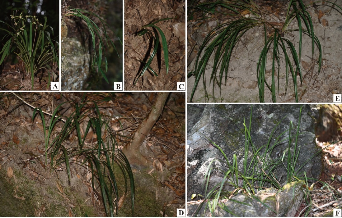兰属植物. A: 寒兰 Cymbidium kanran,B: 多花兰Cymbidium floribundum,C: 墨兰 Cymbidium sinense,D: 莎叶兰 Cymbidium cyperifolium,E: 春兰 Cymbidium goeringii,F: 蕙兰 Cymbidium faberi.