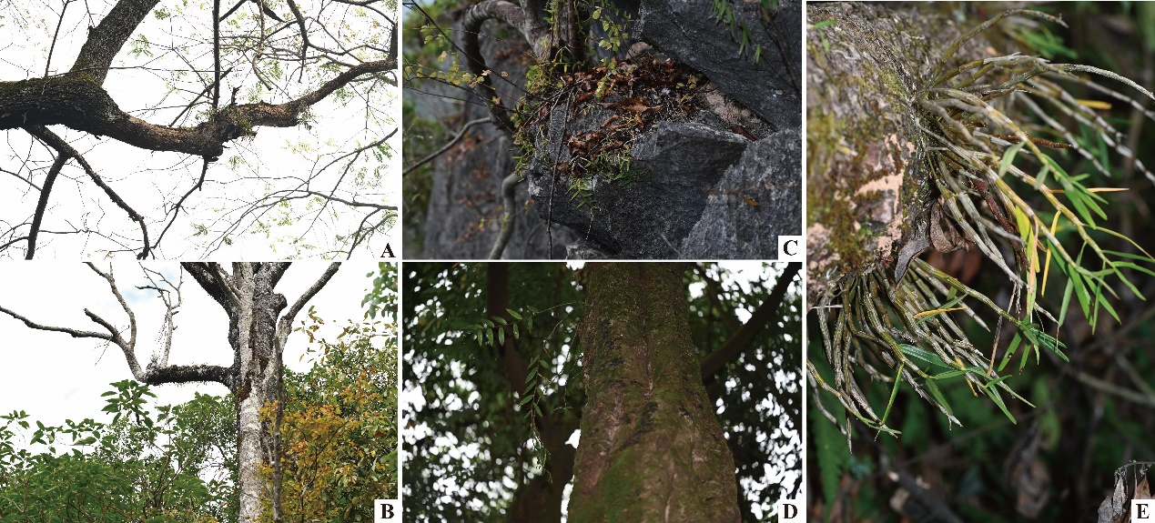 石斛属植物. A: 铁皮石斛 Dendrobium officinale,B: 细茎石斛 Dendrobium moniliforme,C: 美花石斛 Dendrobium loddigesii,D: 始兴石斛 Dendrobium shixingense,E: 重唇石斛 Dendrobium hercoglossum.