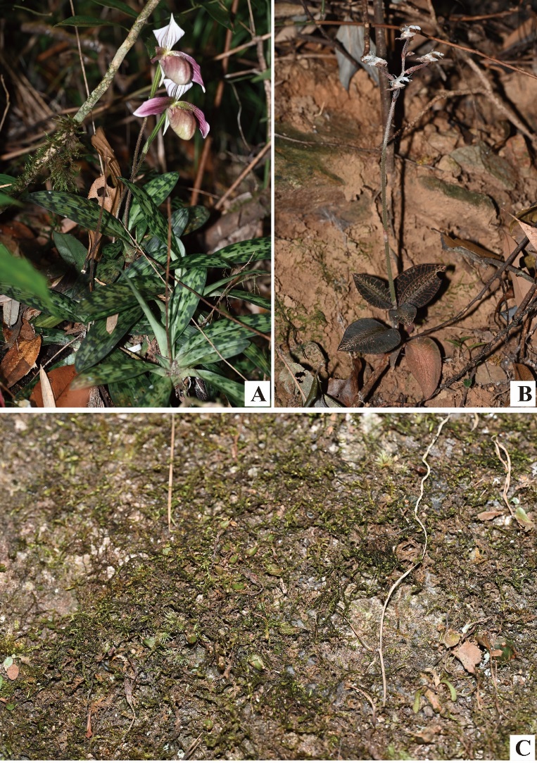 绽放中的紫纹兜兰(Paphiopedilum purpuratum,A)和金线兰(Anoectochilus roxburghii,B)以及休眠中的独蒜兰属植物(Pleione sp.,C).