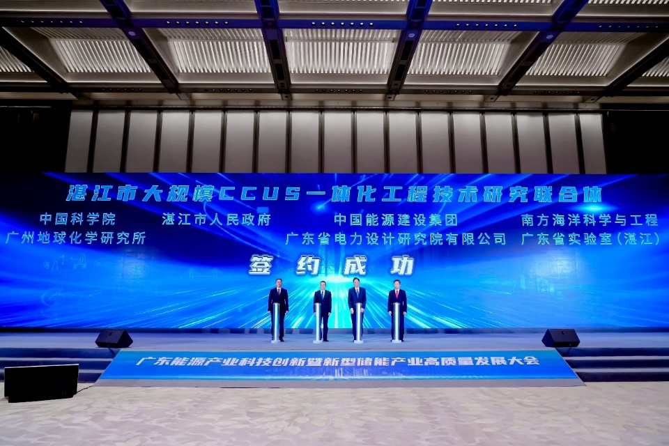 2024年11月22日,广东能源产业科技创新暨新型储能产业高质量发展大会在广州市白云国际会议中心召开。大会以“逐绿向新 能动未来”为主题,抢抓新型储能等能源产业发展重大机遇,助力广东加快建设科技创新强省。在合作平台签约仪式上,作为10家签署协议单位的代表,湛江市人民政府、中国能源建设集团广东省电力设计研究院有限公司、中国科学院广州地球化学研究所以及南方海洋科学与工程广东省实验室(湛江)共同签署了《关于组建湛江市大规模CCUS一体化工程技术研究联合体的备忘录》。据悉,联合体将采用“产学研用”相结合的创新机制,充分整合各方资源与技术优势,加速CCUS技术的创新步伐和产业发展。中国能建广东院将负责CO2捕集、储运及利用的工程应用,中国科学院广州地化所负责地球化学监测方案研究,湛江湾实验室将开展长距离输送研究,湛江市政府则将在政策支持和项目落地等方面提供保障。