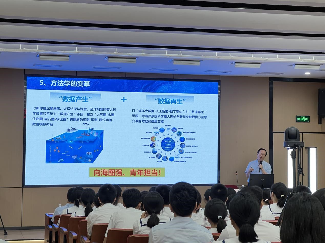 签约仪式后,张偲院士以“向海图强,青年担当”为题,为全校师生带来一场生动的海洋科学知识盛宴。他系统梳理了海洋科学的发展历程与技术突破,结合我国深海探测、海洋生态保护、冷泉生态系统研究等重大工程,勉励青少年“夯实基础研究,勇攀科技高峰”,以实际行动服务海洋强国战略。现场互动热烈,学子们纷纷表示要将个人理想融入国家发展大局。