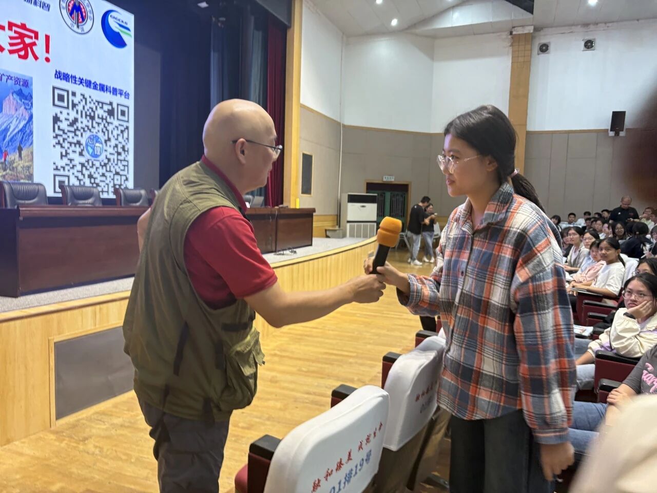 赵太平围绕矿产资源展开科普,阐释定义与属性,解析成因及分布规律;从人类文明史角度,说明矿产推动生产力跃升,指出我国关键金属依赖进口的挑战;并以可可托海3号矿坑为例,强调地质研究的战略价值。他现场展示矿石标本及考察照片,同时纠正“地理属文科”误区,鼓励学生报考中国科学院大学。互动环节,他解答找矿技术等问题,向优秀提问者赠送矿石标本。