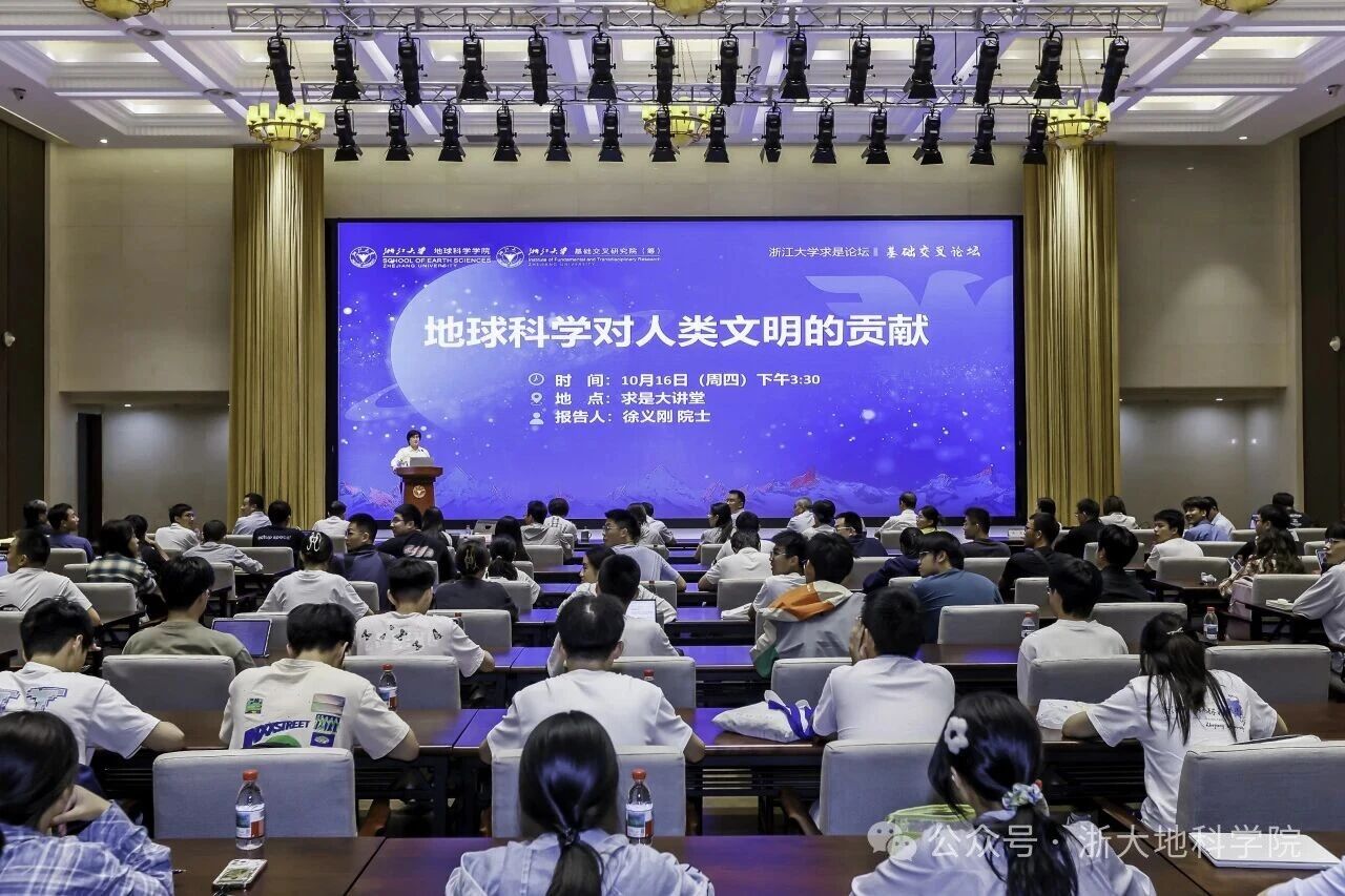 10月16日,浙江大学求是论坛与基础交叉论坛联合举办的《地球科学对人类文明的贡献》专题讲座暨地球科学学院“科学会客厅”第9期活动在紫金港校区求是大讲堂举行。特邀中国科学院院士、中国科学院广州地球化学研究所研究员徐义刚担任主讲。浙江大学副校长王靖岱,中国科学院院士张宏福,图书馆党委书记王苑,基础交叉研究院(筹)副院长单立楠、程磊,地球科学学院领导班子和师生代表等出席活动。
