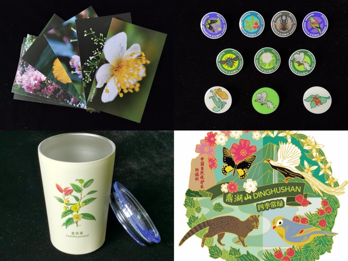 鼎湖山四季冰箱贴以保护区不同季节的特色景观和生态环境为主题,以昆虫(金裳凤蝶)、鸟类(红嘴相思鸟、白鹇)、兽类(豹猫)为核心,覆盖鼎湖山不同类群珍稀生物,通过冰箱贴的形式进一步丰富文创对物种多样性的呈现维度;物种多样性系列文创则聚焦保护区内丰富的动植物资源,产品涵盖徽章、水杯、明信片三大类,每类产品均深度融合鼎湖山独特的生态资源,兼具观赏性、实用性与科普性。