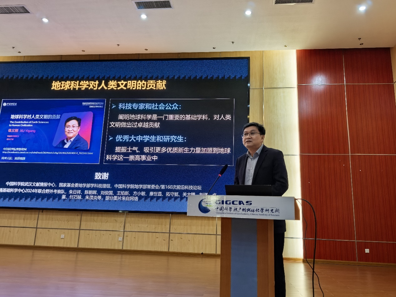 徐义刚院士带来《地球科学对人类文明的贡献》为主题的报告。针对地球这一“横跨数万里、上下数亿年”的复杂系统,从“没有地球科学就没有进化论”、“没有地质学就没有工业革命”、“改变了世界的地图和板块构造理论”、“气候变化研究改变世界经济发展范式”四个方面系统阐释了地球科学对人类文明历史贡献。从“颠覆认知”“创造财富”“治理规则”三重维度,总结了我国地学对世界/中国的贡献。他也与大家分享了一些思想感悟和未来地球科学的发展态势。最后,他以“旅行者1号”在64亿公里外拍摄的地球(“暗淡蓝点”)照片呼吁我们要珍惜和保护这颗蓝色的星球,并与38万公里外所的地球的照片作对比,感叹地球之美、地学之美。