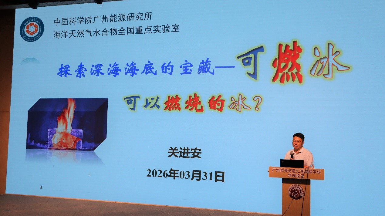 3月31日下午,广州能源所天然气水合物研究中心正高级工程师关进安受邀到广州市天河区汇景实验学校华园校区,为初一、初二年级200多名学生作《探索深海海底的宝藏——可燃冰》科普讲座。