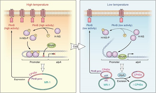 刘晓晓等研究发现希瓦氏菌中的H-NS通过识别噬菌体的切离酶对原噬菌体进行“沉默”,H-NS蛋白的磷酸化是“沉默”原噬菌体的关键。常温下,细胞内大部分H-NS蛋白为磷酸化状态,磷酸化H-NS可沉默原噬菌体上具细胞毒性基因的表达;低温促进H-NS去磷酸化,改变H-NS对DNA的结合方式,解除H-NS对特定原噬菌体的沉默,帮助希瓦氏菌适应低温环境。这是首次发现,细菌将外界温度变化转化为细胞内H-NS蛋白磷酸化水平的变化,说明H-NS蛋白的“翻译后修饰”可作为“分子开关”,实现对特定原噬菌体“沉默-激活”的精准调控。研究结果对于我们理解细菌如何“沉默”外源基因并将其整合进宿主中以及细菌与噬菌体的共进化过程提供了新的认识。