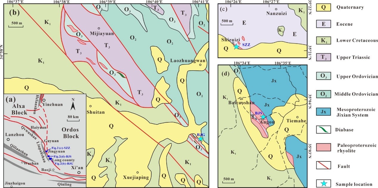 图1 (a) 鄂尔多斯地块西南缘构造简图。BJG-白家沟流纹岩;SZZ-石嘴子流纹岩;BJS-保家山流纹岩。(b)白家沟流纹岩,(c)石嘴子流纹岩和(d)保家山流纹岩地质简图。