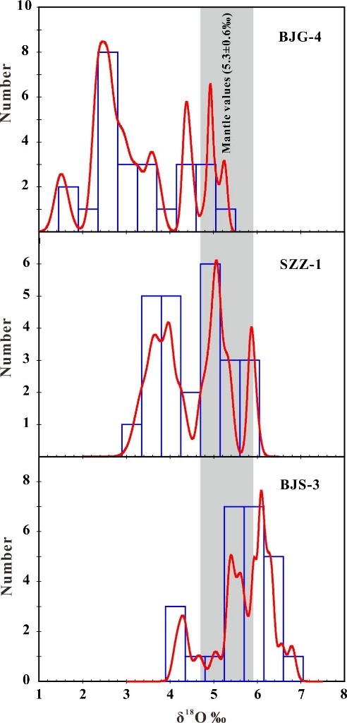 图2 白家沟、石嘴子和保家山流纹岩锆石δ18O组成频率分布直方图