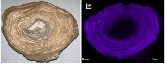 图2. 柴达木盆地碳酸盐结核的圈层结构。浅色圈层的锰含量更高,碳酸盐结晶度更好,孔隙度更大,代表形成环境的盐度更高