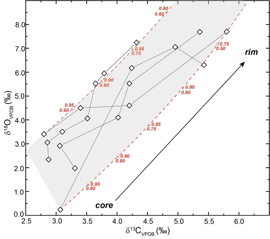 图3. 结核稳定碳氧同位素的瑞利分馏模拟