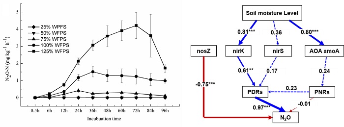 不同水分条件下N2O排放速率(左)及N2O排放的结构方程模型(右)