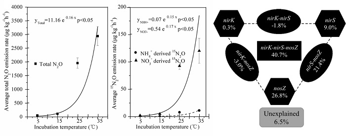 不同温度条件下N2O排放速率(左)及N2O排放的方差分解图(右)