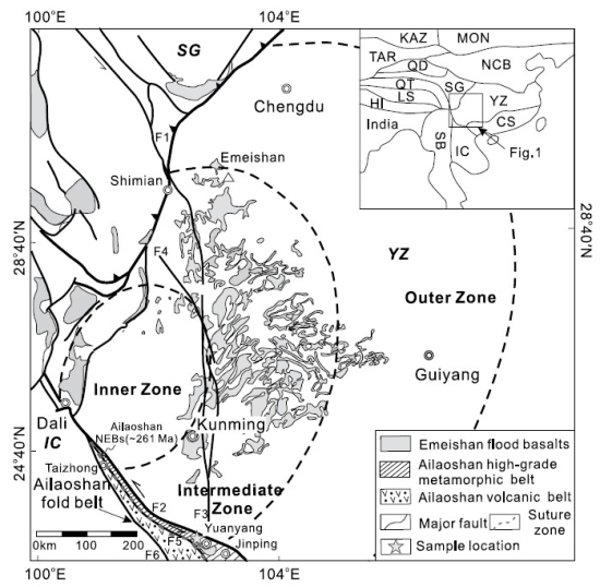 中国科学院广州地球化学研究所夏小平老师团队徐健博士通过对中国云南元阳县峨眉山大火成岩省两大深成花岗岩侵入体的原位微区锆石Hf-O同位素和U-Th-Pb定年,以及全岩主微量元素、Sr-Nd-Hf同位素等地球化学特征进行分析,为晚二叠世俯冲古特提斯洋板块与峨眉山地幔柱相互作用提供了证据。