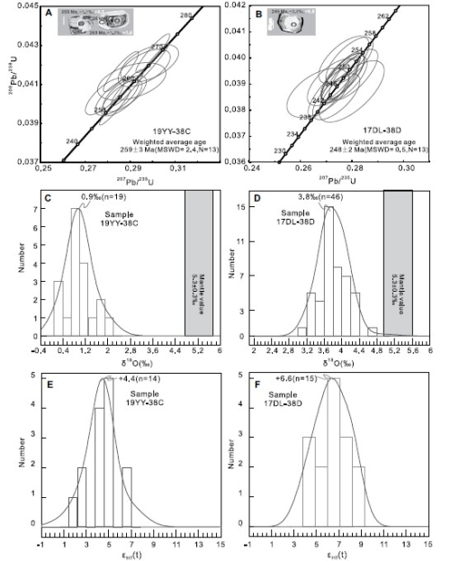 这两大深成侵入体出露于峨眉山火成岩省中带哀牢山构造带的变质杂岩体中 (图1),分别为晚二叠世和早三叠世的A型花岗岩,主要由石英、碱性长石、斜长石、角闪石、黑云母以及锆石和含Fe-Ti氧化物组成。两个花岗岩深成侵入体的SIMS锆石U-Pb年龄分别为晚二叠纪(259±3Ma) 和早三叠纪(248±2Ma) (图2A-B),与峨眉山主要岩浆作用(约260 Ma)同时期或者稍微年轻。它们的主、微量元素和矿物学显示出典型的A型花岗岩特征:高全碱(7.93–9.68 wt%)、高HFSE(如Zr 、Nb、Ta)含量、高FeOT/(FeOT+MgO) (0.87–0.98)、显著亏损Eu、Sr和Ba、高Ga/Al (3.67–5.06)和透长石的出现。