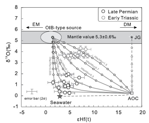 原位微区锆石Hf-O同位素分析显示异常低δ18O (晚二叠纪:0.2–2.0‰,早三叠纪:3.2–4.8‰) (图2)、正的εHf(t) (晚二叠纪:1.6–7.0,早三叠纪:3.9–8.8) (图2),暗示了元阳A型花岗岩的源区有不同比例的热液蚀变洋壳的参与。作者通过对受海水蚀变大洋下地壳的年轻辉长岩与地幔柱来源洋岛玄武岩进行了Hf-O同位素二元混合模拟(图3),结果指示形成晚二叠纪、早三叠纪A型花岗岩分别需要80%-90%和30%-40%的高温热液蚀变洋壳的参与。