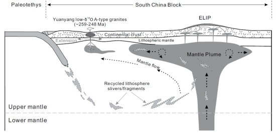 该成果首次报道了元阳晚二叠纪和早三叠纪低δ18O值的A型花岗岩,并提出了扬子板块西部古特斯洋壳与地幔柱相互作用的地球动力学模型(图4)。该模型认为蚀变古特斯洋壳向东俯冲到华南板块之下的上地幔,临近的峨眉山地幔柱可能快速挟带和吸收再循环的岩石圈碎片物质到浅层地幔保存了锆石低δ18O同位素特征,随后形成的混合源减压部分熔融形成了低δ18O同位素A型花岗岩的母岩。地幔柱与俯冲板片的相互作用模型也很好的解释了峨眉山大火成岩省物质(尤其氧同位素)组成的不均一性 。