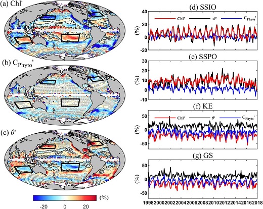 图1. 全球中尺度涡致海表浮游植物叶绿素(Chl)、生物量(CPhyto)和碳与叶绿素之比(θ = CPhyto/Chl)的扰动分布。扰动量由反气旋涡与气旋涡内变量之差除以背景均值得到。右图展示的为副热带流涡区的南印度洋(SSIO)和南太平洋(SSPO),以及中纬度黑潮延伸体(KE)和湾流(GS)(左图黑色方框)海域各变量的时间变化特征。左图中灰色细点标注的为扰动不显著的区域。