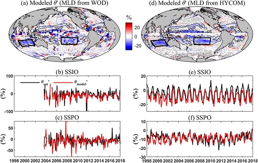 图2. 光驯化模型模拟得到的全球中尺度涡致浮游植物碳与叶绿素之比(θ = CPhyto/Chl)的扰动分布。左图模型所用混合层深度(MLD)由全球现场观测的温盐剖面数据计算所得,右图所用混合层深度数据来源于HYCOM模型的再分析资料。下图展示的为副热带南印度洋(SSIO)和南太平洋(SSPO)光驯化模型与卫星观测结果(图1)的对比。
