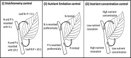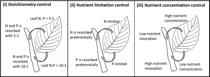 叶片养分回收是植物保存养分的一种重要机能。关于叶片养分回收的研究已有一个世纪的历史。然而该领域的核心问题仍不清楚,即植物叶片是如何回收养分的。通过对前人研究的总结,研究团队首次归纳了植物养分利用策略的三个基本策略:1)化学计量控制的策略;2)养分限制控制的策略;3)养分浓度控制的策略(图 1)。
