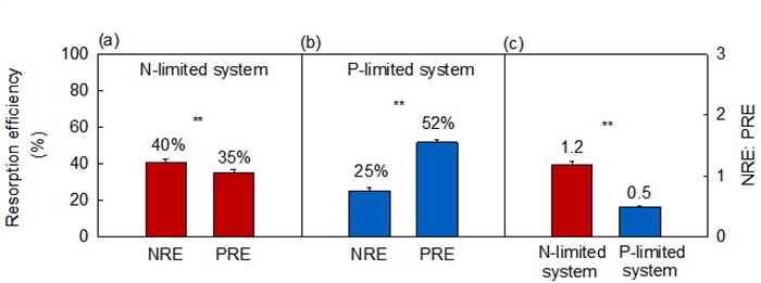 接着,研究也发现了养分限制控制(策略ii)的存在(图2):在氮限制的喀斯特生态系统,氮回收效率(NRE)高于磷回收效率(PRE),而在磷限制的喀斯特生态系统,磷回收效率(PRE)高于氮回收效率(NRE)。