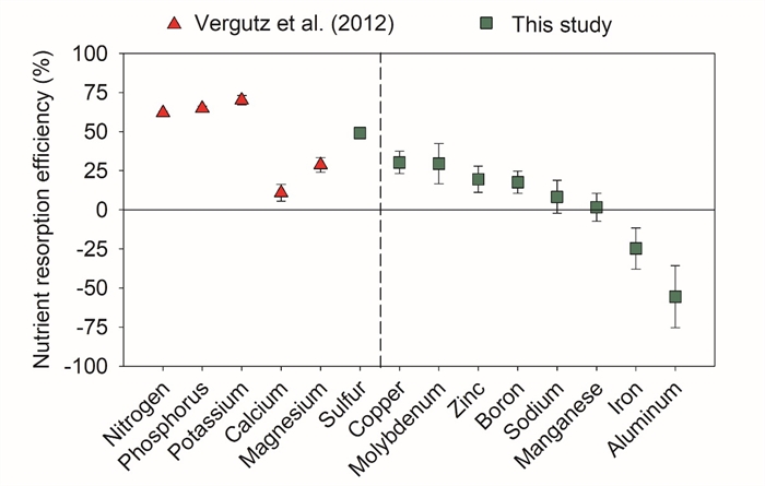 此外,研究者收集并提取了53项已发表的文章的相关数据,研究了8种微量元素的叶片重吸收效率,包括铜(Cu)、钼(Mo)、锌(Zn)、硼(B)、锰(Mn)、钠(Na)、铝(Al)和铁(Fe)。研究发现,在8种微量元素中,重吸收效率从高到低依次为:Cu(30.3%)、Mo(29.5%)、Zn(19.5%)、B(17.6%)、Na(8.3%)、Mn(1.6%)、Fe(-24%)和Al(-55.6%)。其中,Fe和Al的负吸收效率意味着这些元素不会被植物重吸收,反而是在老叶中积累(图 5)。这些研究结果是对前人研究的重要补充(Vergutz et al. 2012),为理解植物叶片养分重吸收提供了更全面的知识。研究强调:结构性元素(即Ca、Mg、B、Na和Mn)和潜在的有毒元素(即Fe和Al)的叶片重吸收效率相对较低,甚至没有。这些特殊性应在生物地球化学模型中得到充分的考虑。