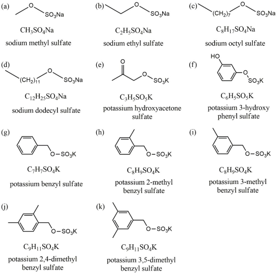 与美国马里兰大学、中国科学院化学研究所、中国科学院地球环境研究所等国内外单位合作,中国科学院广州地球化学研究所有机地球化学国家重点实验室、深地科学卓越创新中心彭超博士(合作导师:唐明金研究员)使用蒸汽吸附分析仪、吸湿性串级差分电迁移率分析仪、云凝结核计数仪,研究了十一种代表性有机硫酸酯(见图1)的吸湿性和云凝结核活性。研究发现,不同样品的吸湿性存在着很大的差异:甲基、乙基、辛基和羟基丙酮硫酸酯具有较强的吸湿性,而十二烷基硫酸酯及六种芳香烃类硫酸酯在相对湿度为90%时仍未表现出显著的吸湿增长。对于甲基、乙基及辛基硫酸酯,其吸湿性及云凝结核活性均随着碳链长度的增加而减小,表明憎水性碳氢官能团的增加将显著降低有机硫酸酯的吸湿性。