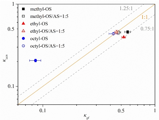 图2. 甲基、乙基、辛基硫酸酯及其与硫酸铵内混气溶胶在亚饱和(κgf)及过饱和(κccn)条件下的吸湿性参数
