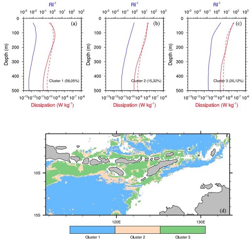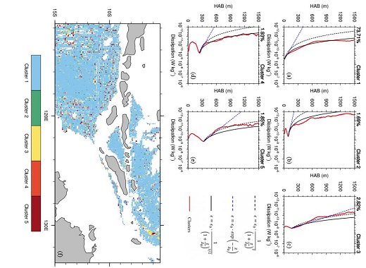 研究人员基于一个垂向高分辨率的非静力海洋模式,对印尼贯穿流出口处的内潮耗散率垂向结构进行聚类分析,以探究内潮耗散率垂向结构的多样性及空间分布特征。研究结果表明:在海洋底部附近,内潮耗散率存在5种典型的垂向结构(图1,其中底部增强结构分布最为广泛),而且从耗散率最大值点向上衰减的垂向结构均可由同一指数函数近似拟合;而在温跃层附近,内潮耗散率存在3种垂向结构(图2,其中温跃层增强结构多分布于水深较深的区域,而表面增强结构多分布于水深较浅的岛屿边缘),而且均与Ri-1(Richardson数的倒数)存在显著的相关。