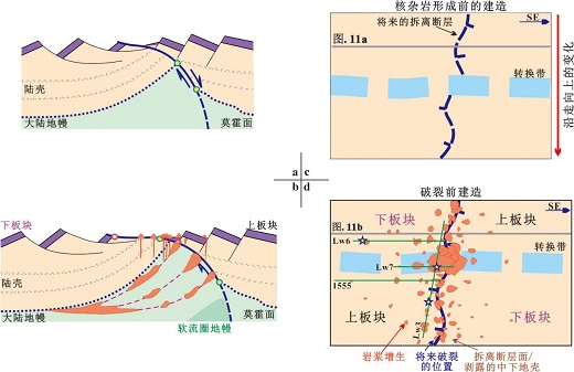 (a)观察到的上板块和下板块建造导致核杂岩构造的解释;(b)破裂前的核杂岩建造以及岩浆作用的叠加;(c)核杂岩构造形成前的建造和先存转换断层带;(d)基底面性质、板块极性和岩浆活动沿陆缘走向的高度变化指示了转换断层带的存在,以及相关的陆缘区段性