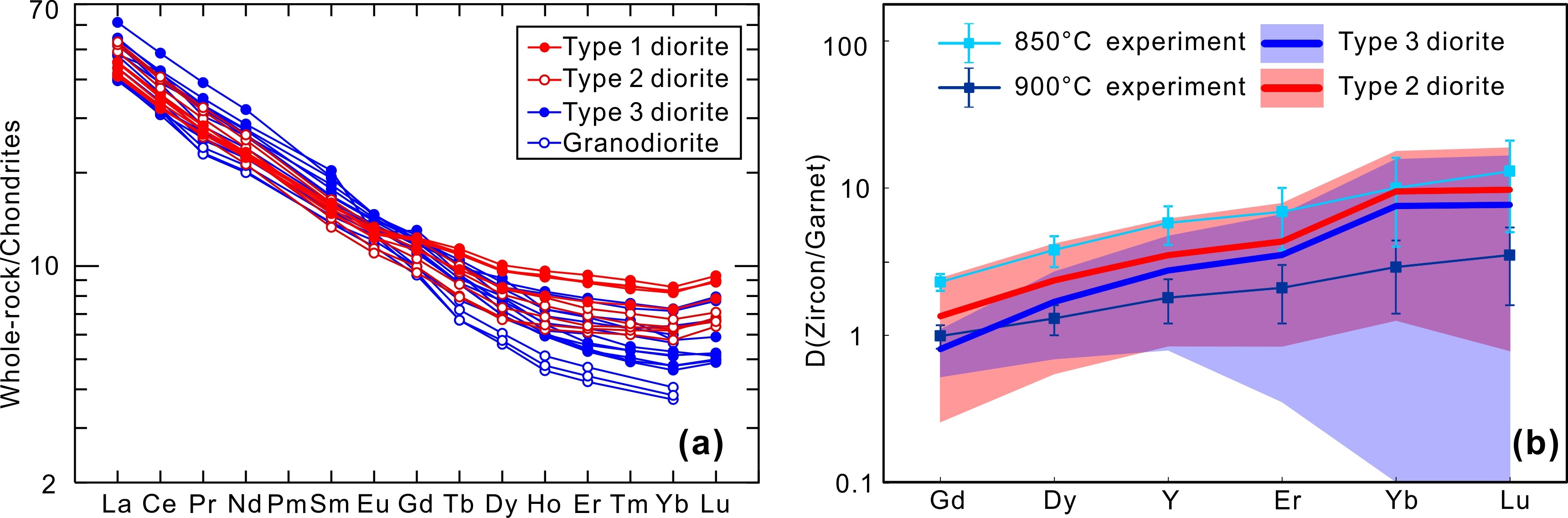 图1.(a)全岩稀土配分图;(b)锆石与石榴石的重稀土分配系数