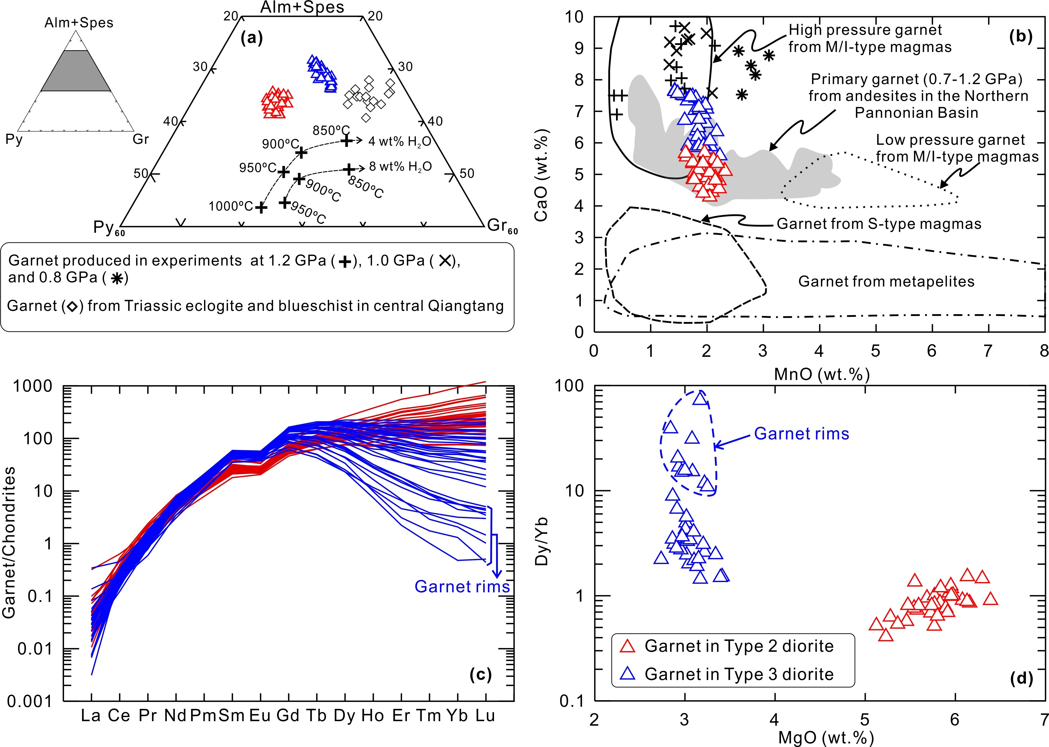 (2)石榴石为富钙贫锰的铁铝石榴石(图2a),与幔源岩浆高压结晶石榴石组成一致(图2b)。第三类闪长斑岩的石榴石具有比第二类更高的CaO和Dy/Yb以及低的MgO(图2b、d),这些差异也体现在它们的寄主全岩上,即石榴石组成随着寄主全岩的组成变化而变化;石榴石与岩浆锆石之间的重稀土分配系数与实验测得的平衡分配系数一致(图1b);且正交光下可见石榴石与长石斑晶存在交生关系。这些都表明石榴石是从寄主岩浆中结晶的,而不是捕掳晶。