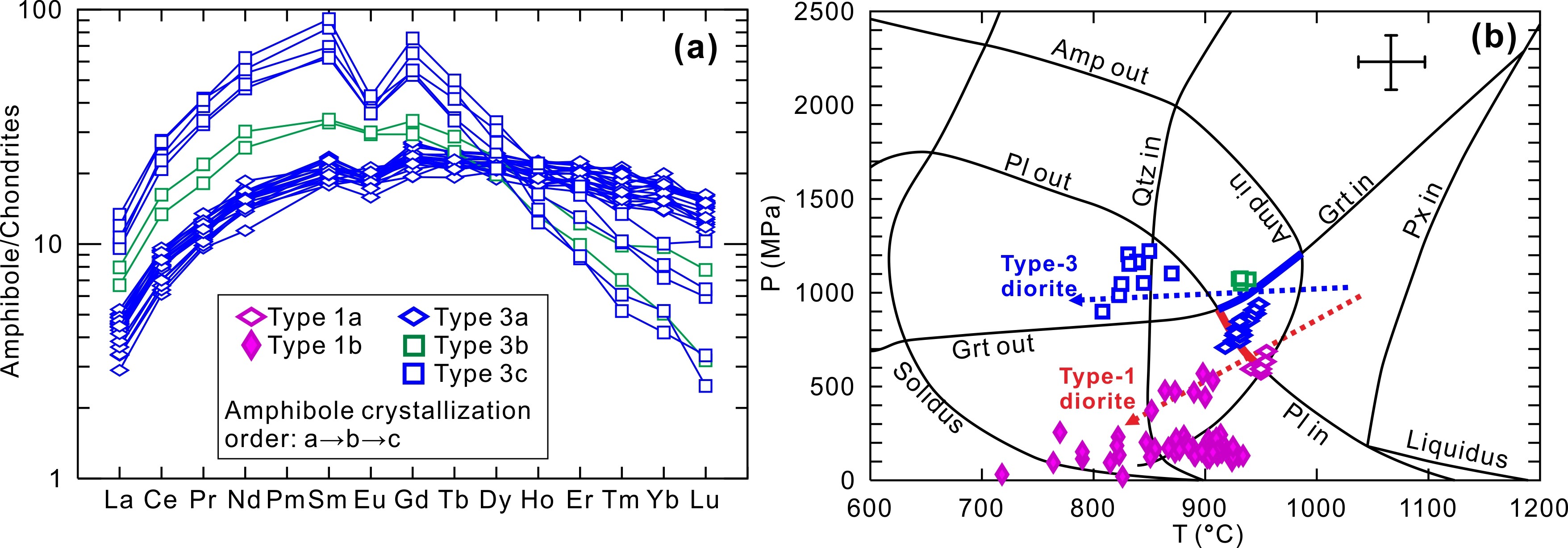 图3.(a)不同期次的角闪石稀土配分图;(b)含水(5 wt.%)安山岩相图与角闪石温压估计值,其中红、蓝实线是根据矿物结晶顺序限定的岩浆演化通过的温压区间
