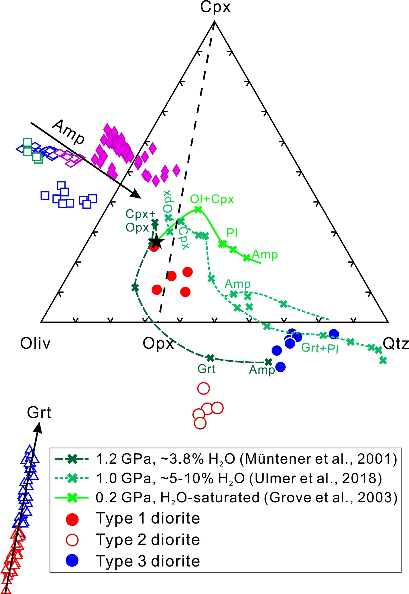 图4. Pl投影的Ol-Cpx-Qtz三元图来表示角闪石、石榴石以及寄主闪长斑岩的组成变化(不同压力实验得到的液相演化线做为对比)