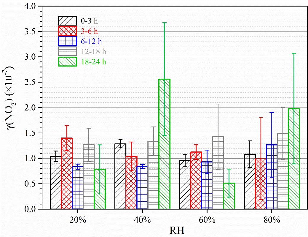 图1. 不同RH和反应时长下NO2平均反应摄取系数