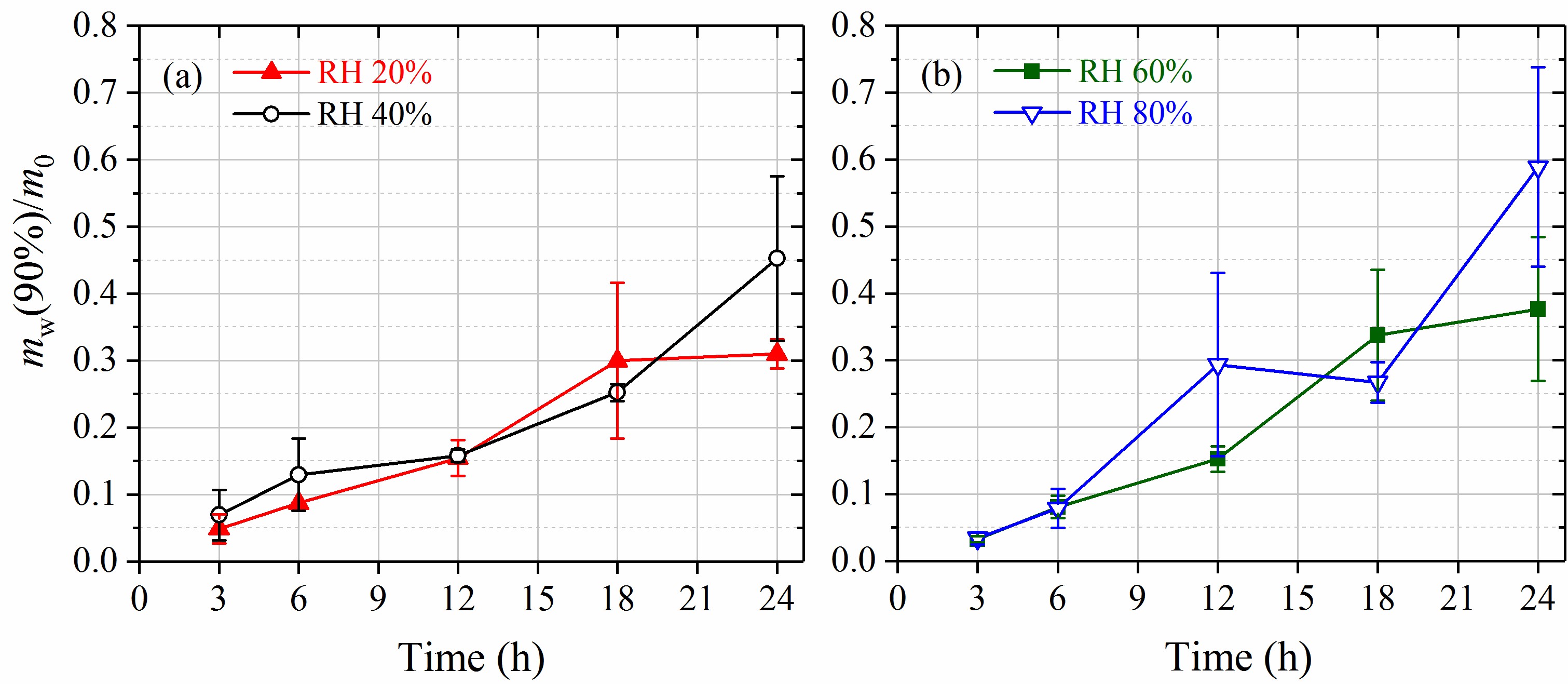 图2. 与NO2非均相反应后CaCO3在90% RH下吸附水与干燥状态下未反应初始CaCO3质量比(mw(90%)/m0)随反应时间变化