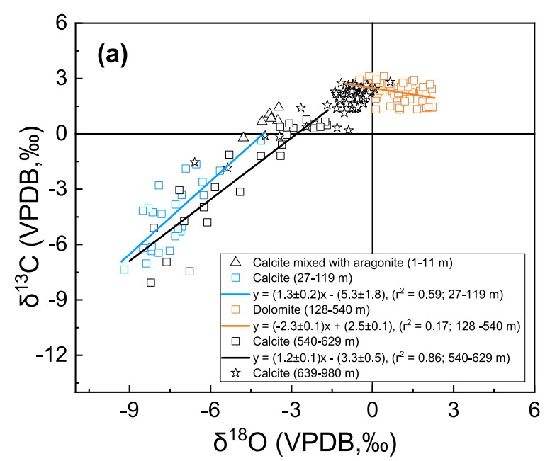 图1 不同深度碳酸盐碳氧同位素组成特征