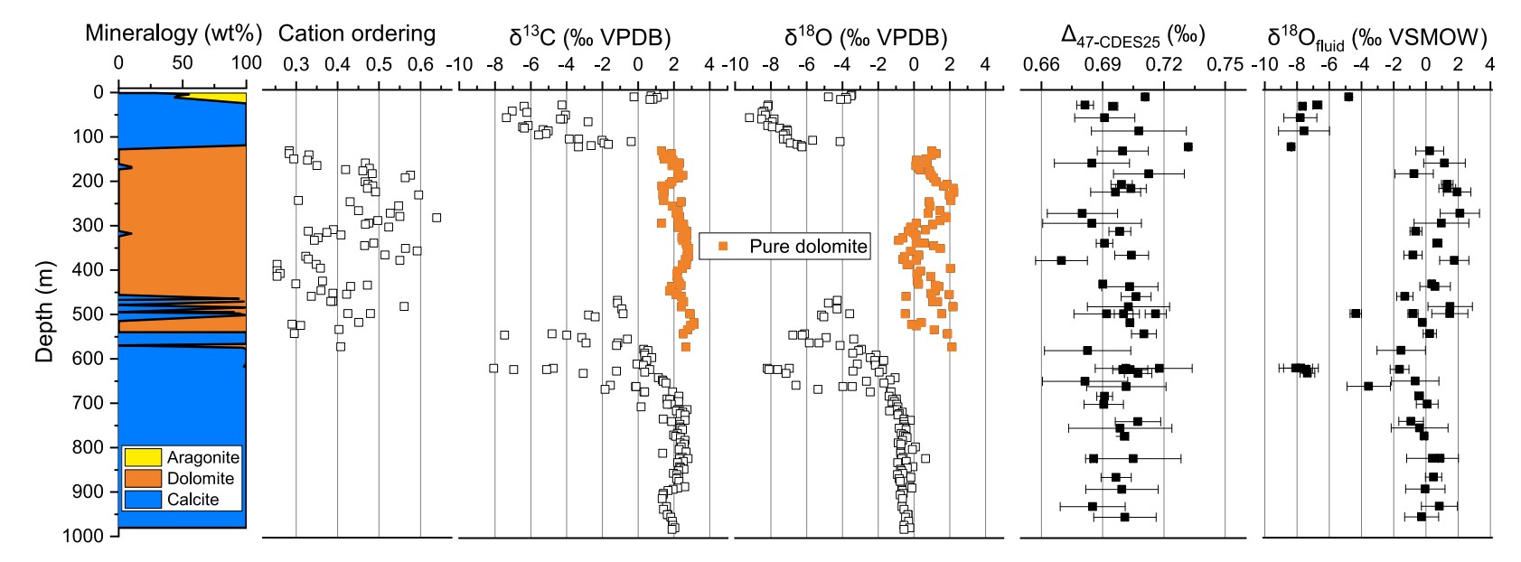 2)美济礁中部约128到540米之间整体发育有纯度较高的白云石,有序度在0.3-0.6之间。岩相分析表明,这些白云石主要为交代和胶结成因,联合碳酸盐δ18O和Δ47温度计获得流体δ18O值表明,这些白云石是在接近现代海水环境条件下的蚀变产物(图2);