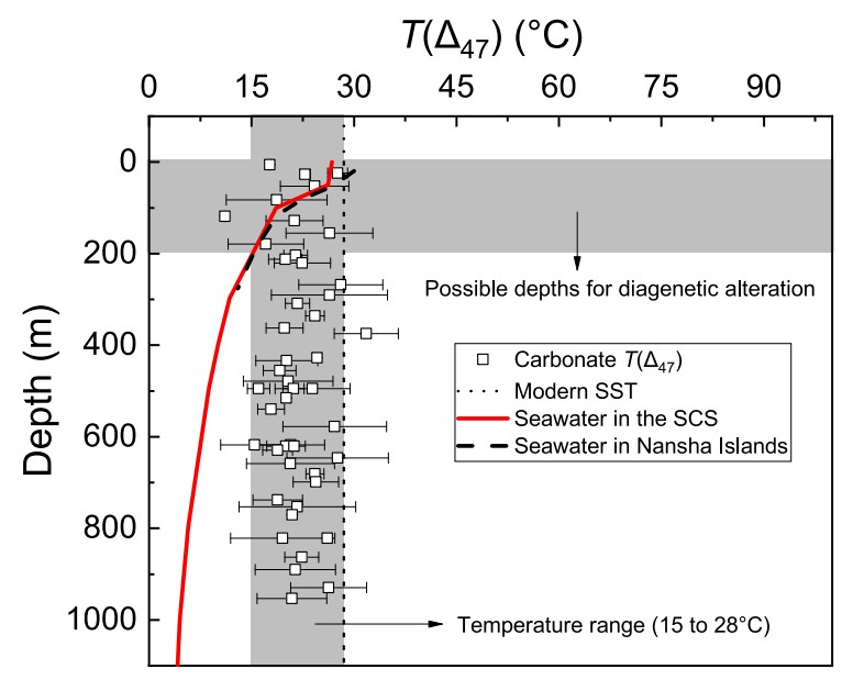 3)通过美济礁碳酸盐Δ47温度与海水垂向温度剖面对比分析,大部分成岩蚀变过程(方解石化、白云石化等)很可能发生在海平面以下约200米的水深范围以内(图3)。整个岩芯的Δ47值虽然记录了礁体早期成岩蚀变的温度,但依然反映了地表热带气候环境温度条件。