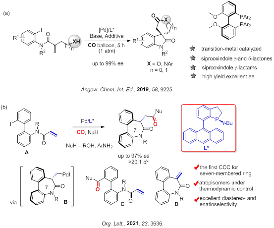 然而,过渡金属催化的不对称羰基化反应是羰基化领域的一个难点。这是因为一氧化碳可以作为配体与金属中心发生配位,从而影响手性配体的调控。因此,过渡金属催化的不对称羰基化反应是有机合成领域中一项非常具有挑战性的课题。之前成功的例子主要集中在过渡金属(Pt, Rh, Pd)催化的烯烃的氢羰基化类型的反应上,这类反应通常需要较高压力的CO和H2,反应条件比较苛刻,产物的结构也比较单一。